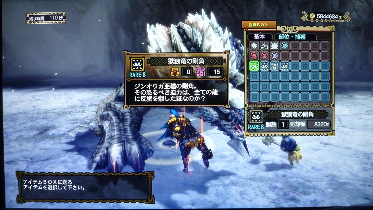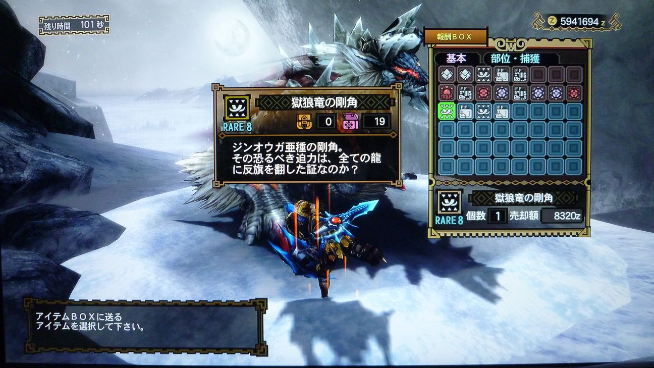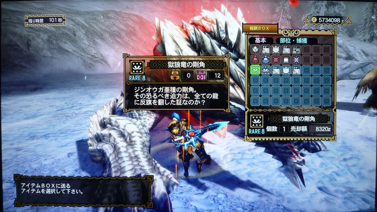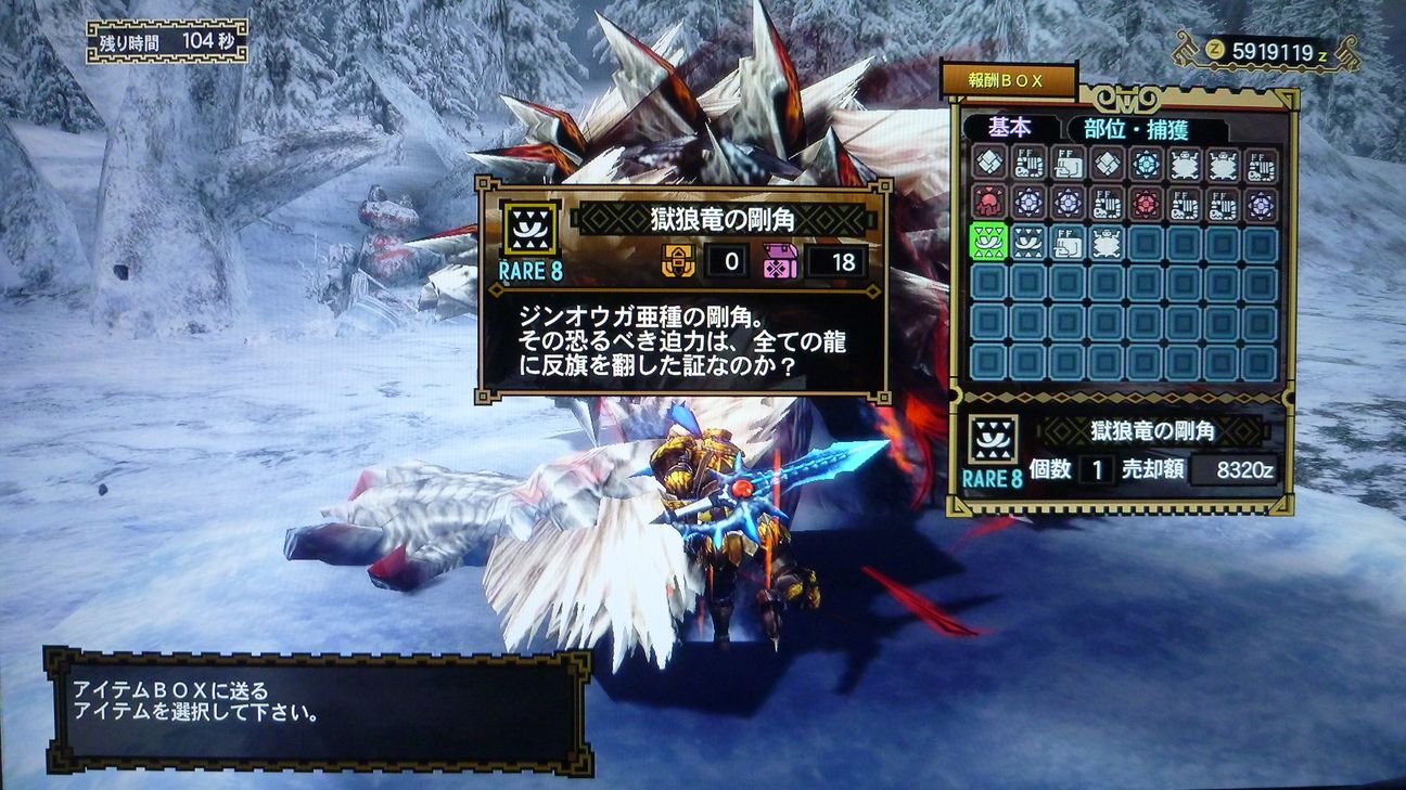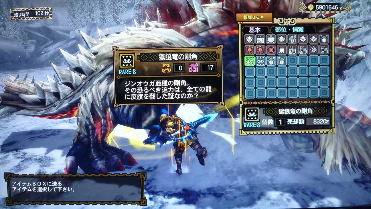 …と捕獲した後の画像でありますが、剥ぎ取り前後がちょうどジンオウガのターンに