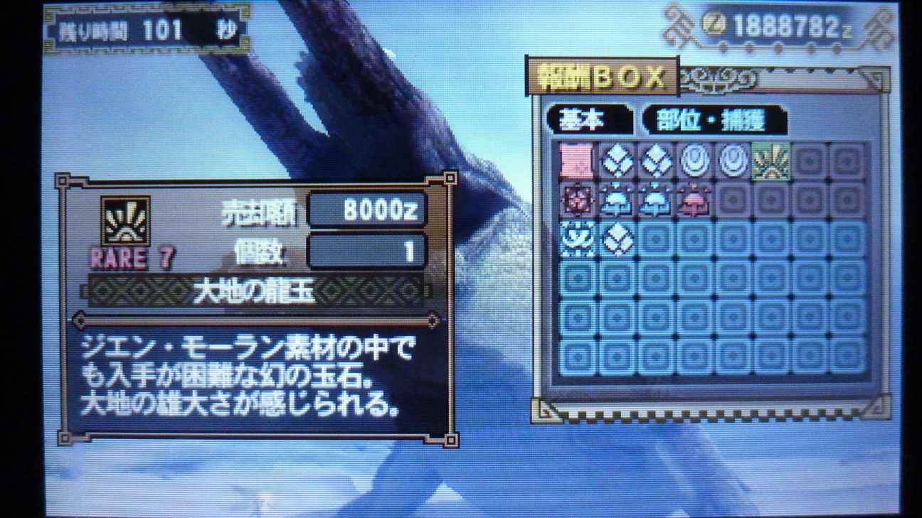 ネブラ口と剛爪、そして真鎧玉3つ!! 今回の良収穫はこんなとこ。