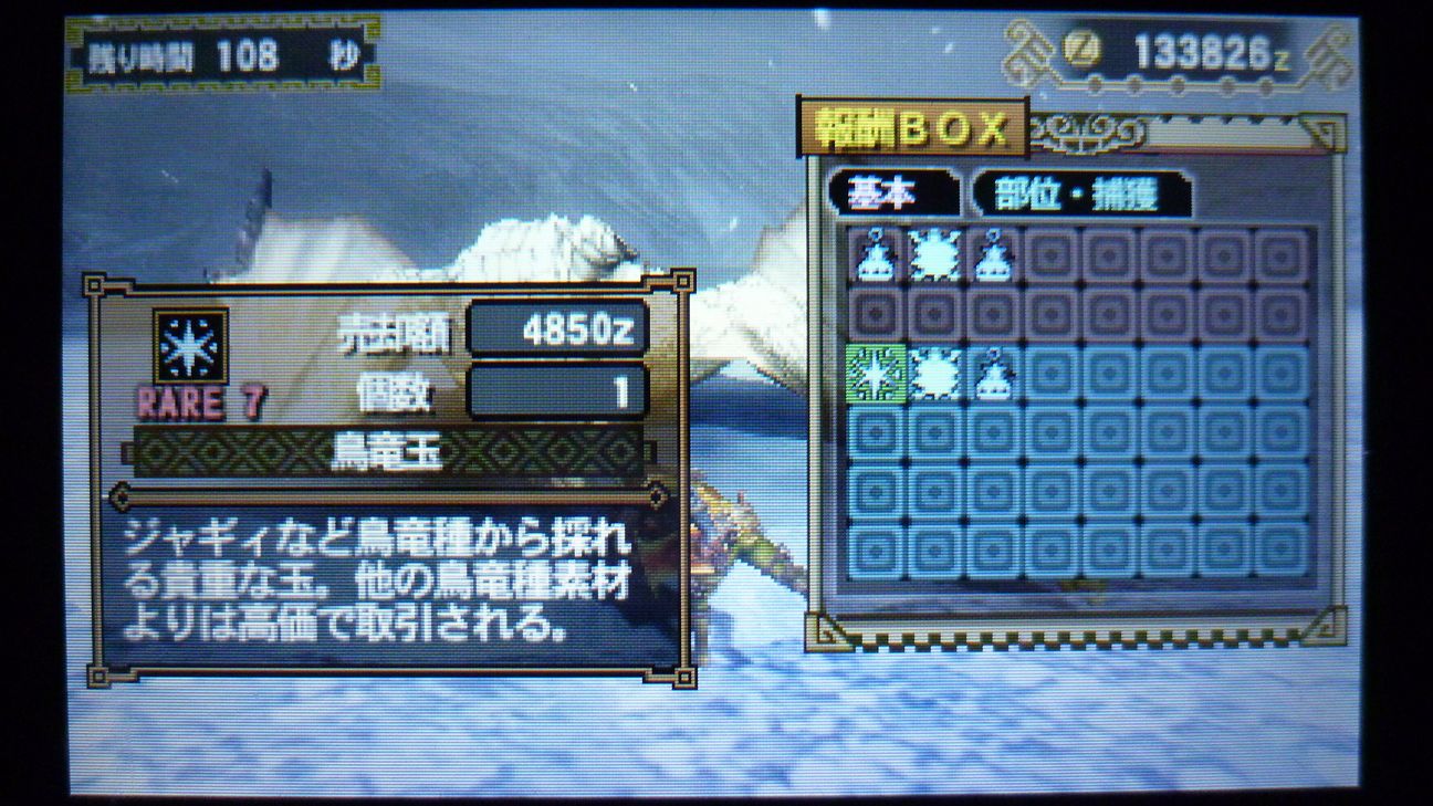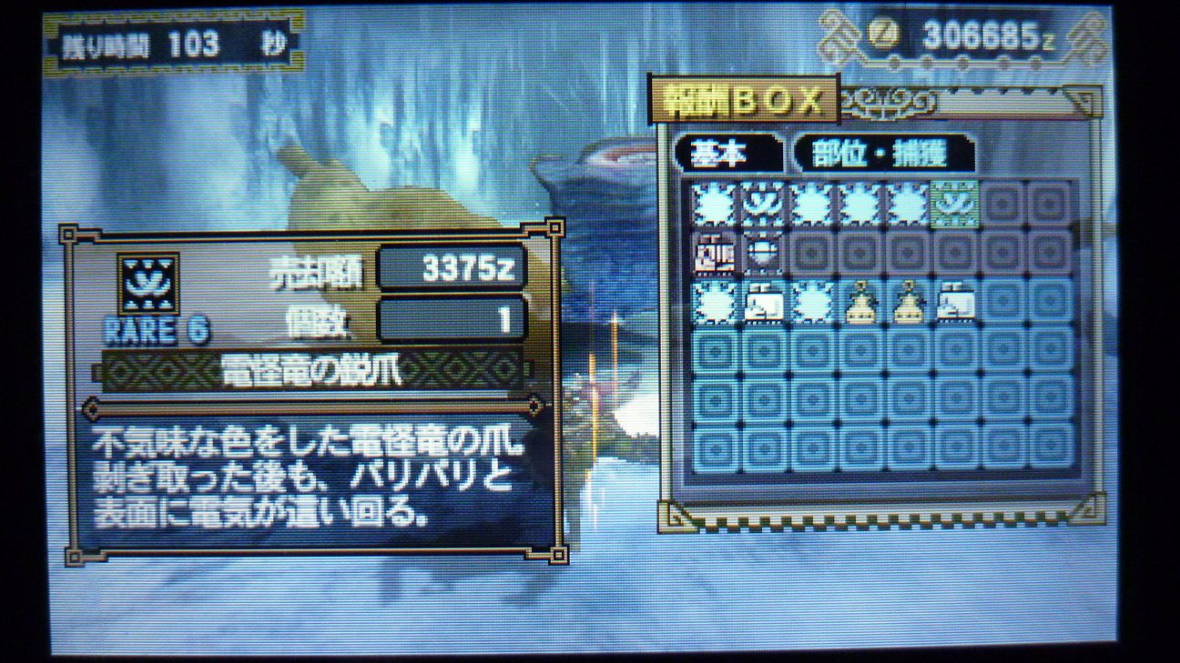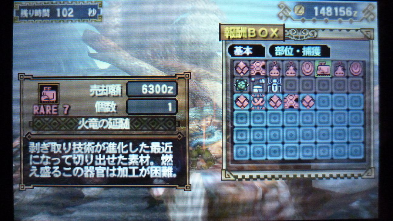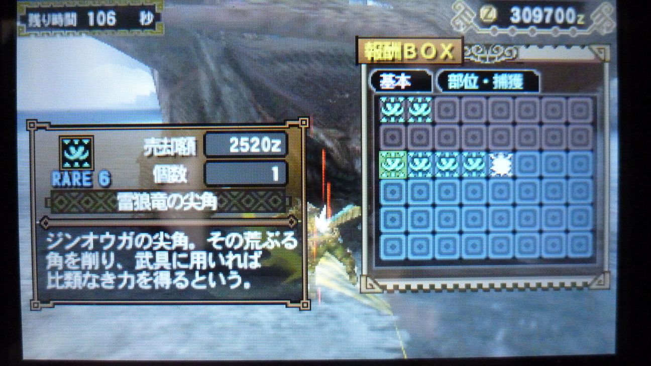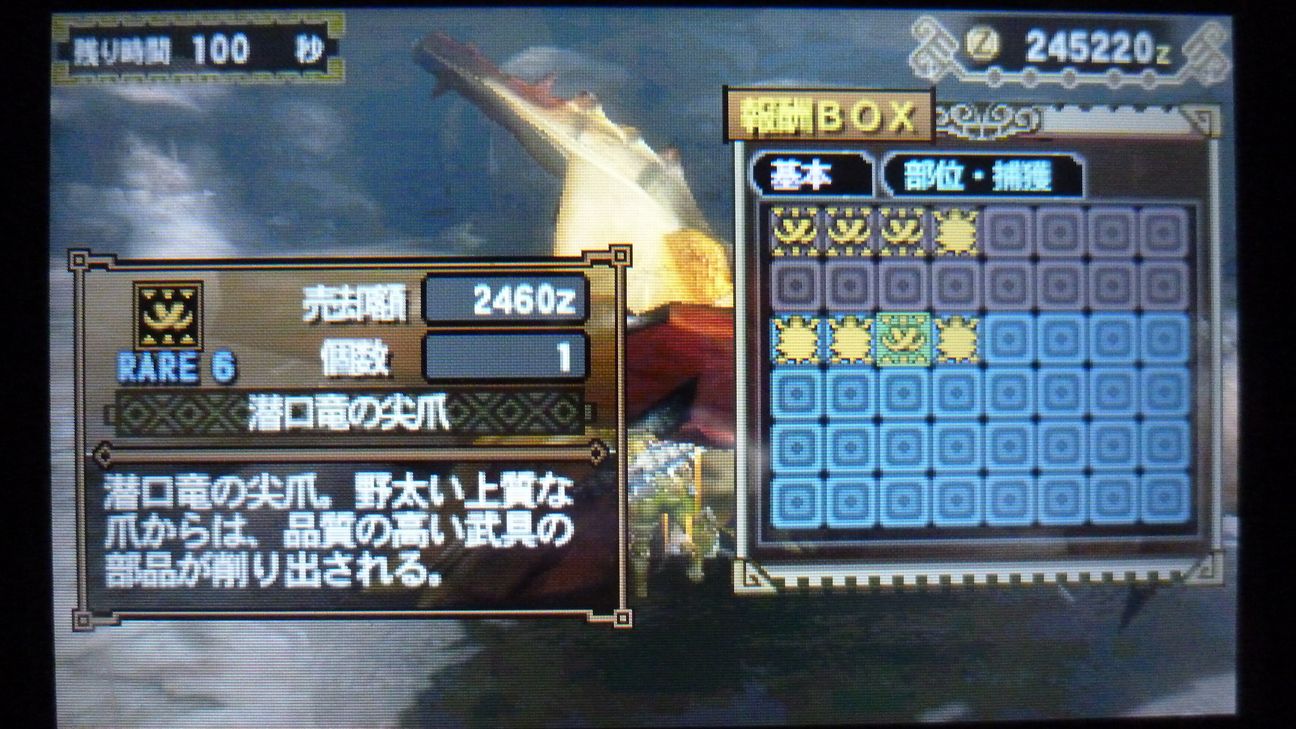 爪が…あと1個でラギア武器強化できるんだが…ジンオウガ武器作ったので今じゃなくてもいいか。