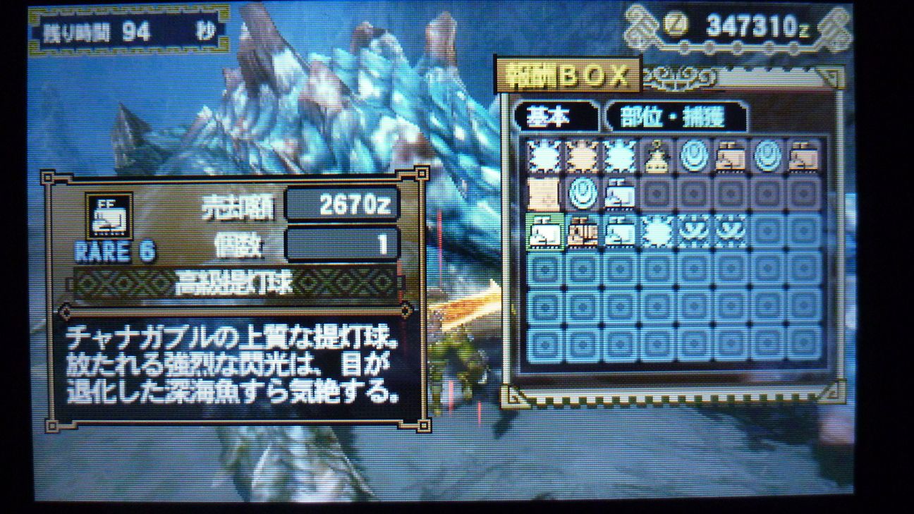 ナルボ改の威力をアテにしつつ、音爆弾と閃光玉もお忘れなくということで、