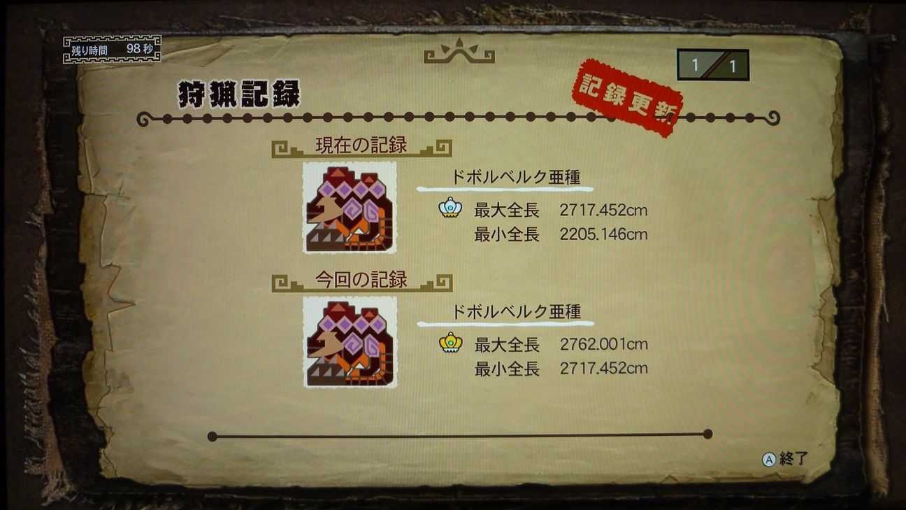 つい先程、高難度ドボル亜種2頭クエにて最大金冠出ました!