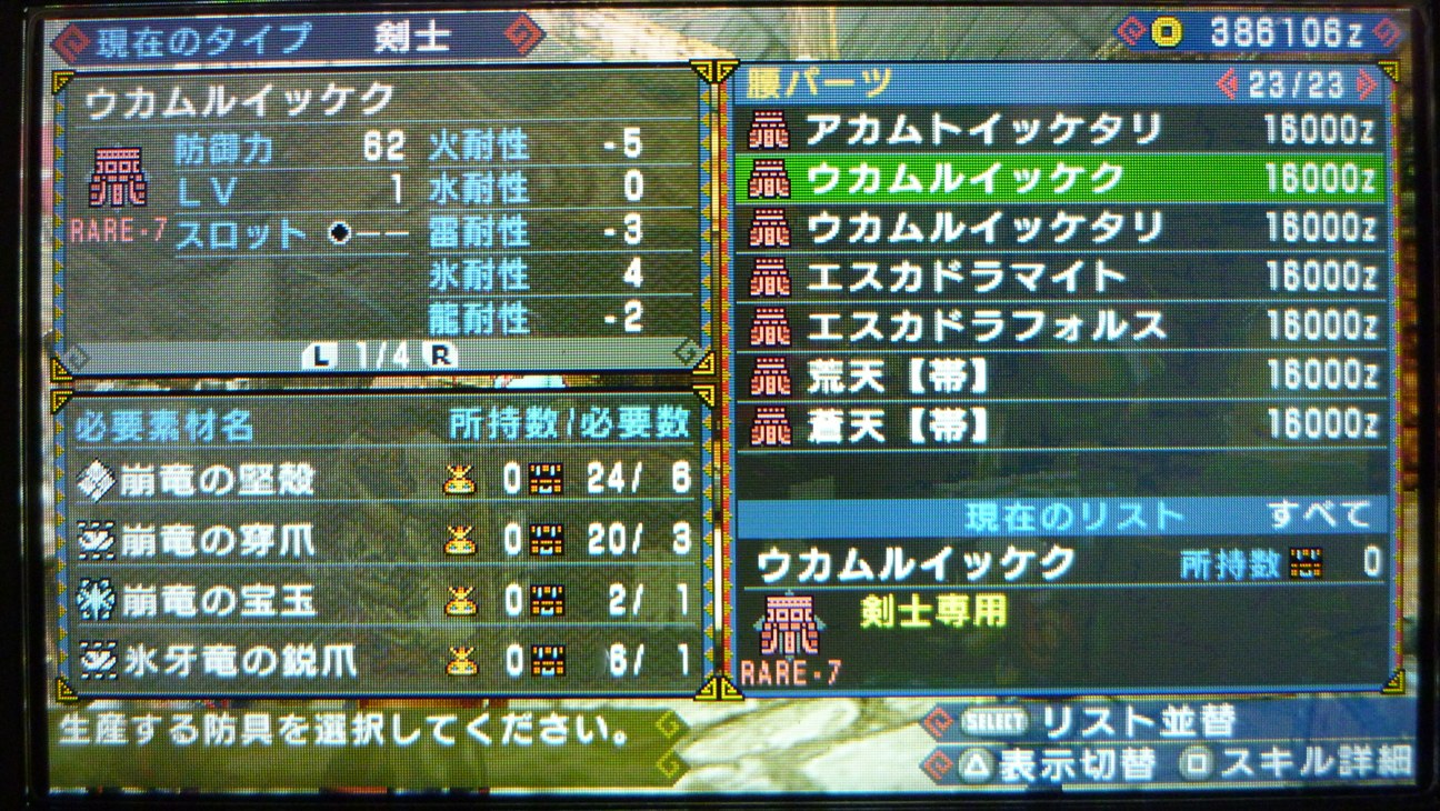 ウカムは削顎が集まらなくて、作成前にクエ行ってきてようやく数が揃ったトコで作成。