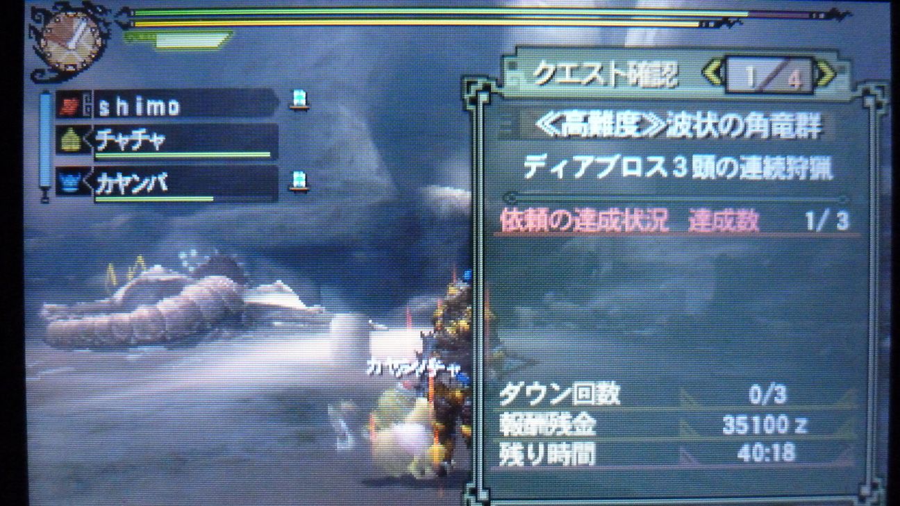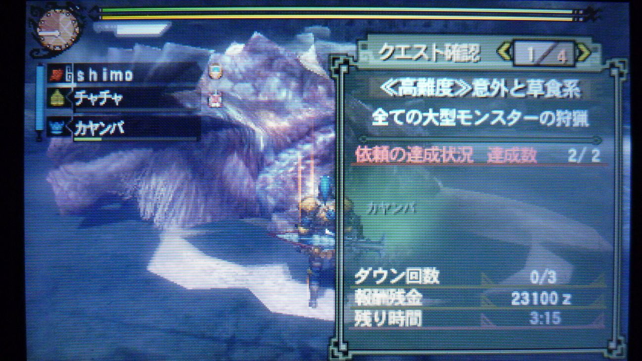 乱入ジャギィは難なくいけるが、今回はサイズが大きいせいか攻撃スカってチャンスロスが多かったなぁ。