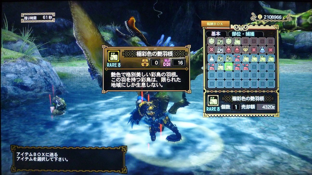 今回の報酬は、手持ち少ないので艶羽根2、剛翼4、翼1をゲットです。