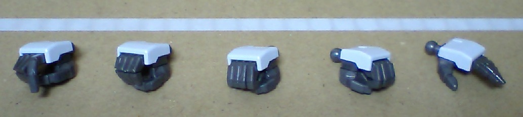 ハンドパーツは左から、銃持ち手(右)、サーベル持ち手(右)、握り手(右・左)、平手(左)が付属。