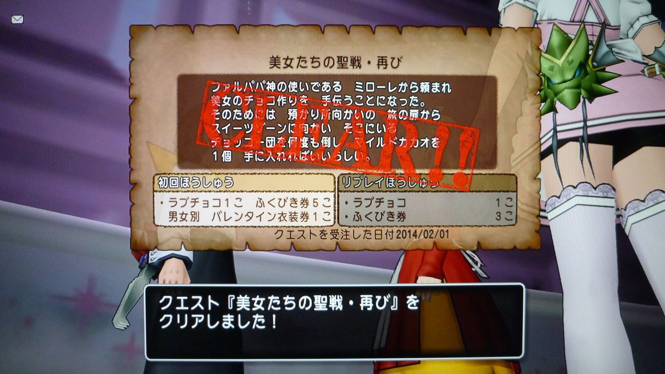 報酬はラブチョコ1つ、ふくびき券5枚、ミローレの衣装券(だいじなもの枠)
