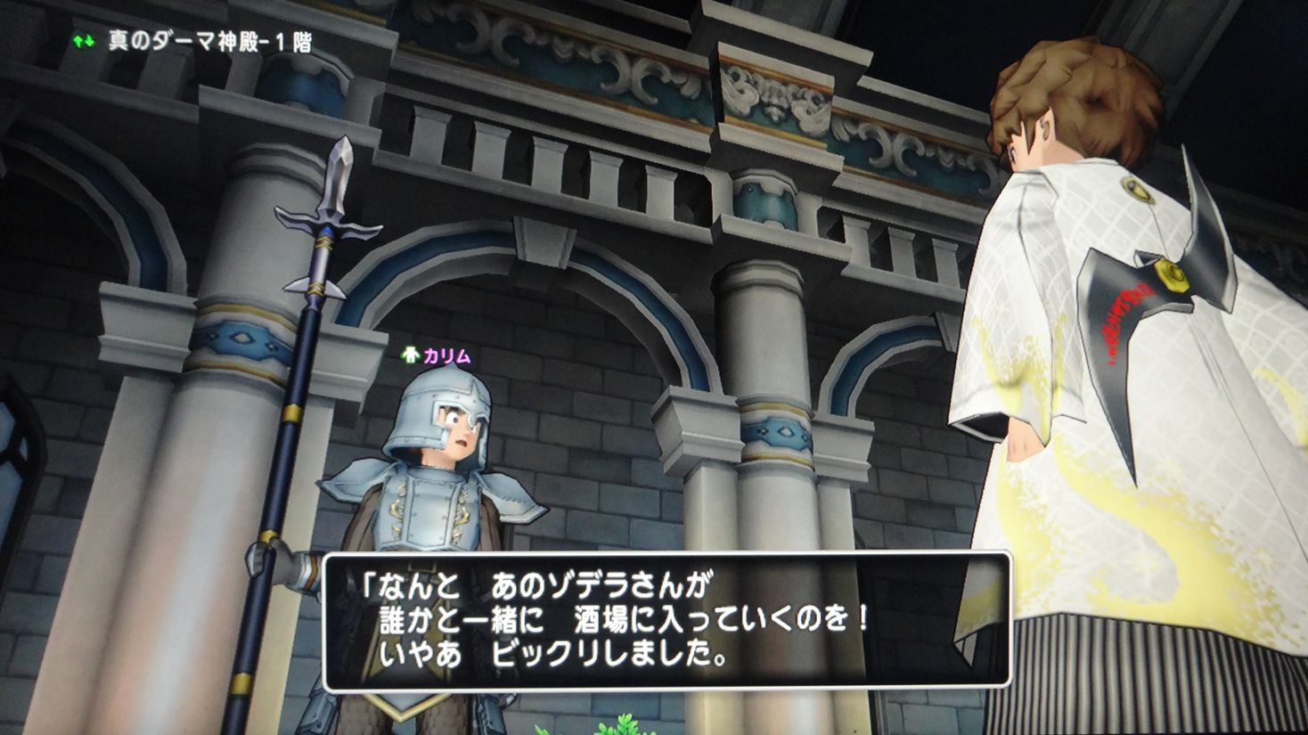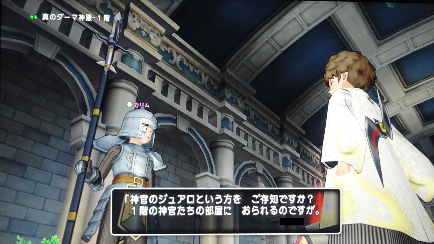 神殿に入ると、近くの衛兵がピンクのポイントになってるので話を聞いてみましょう。